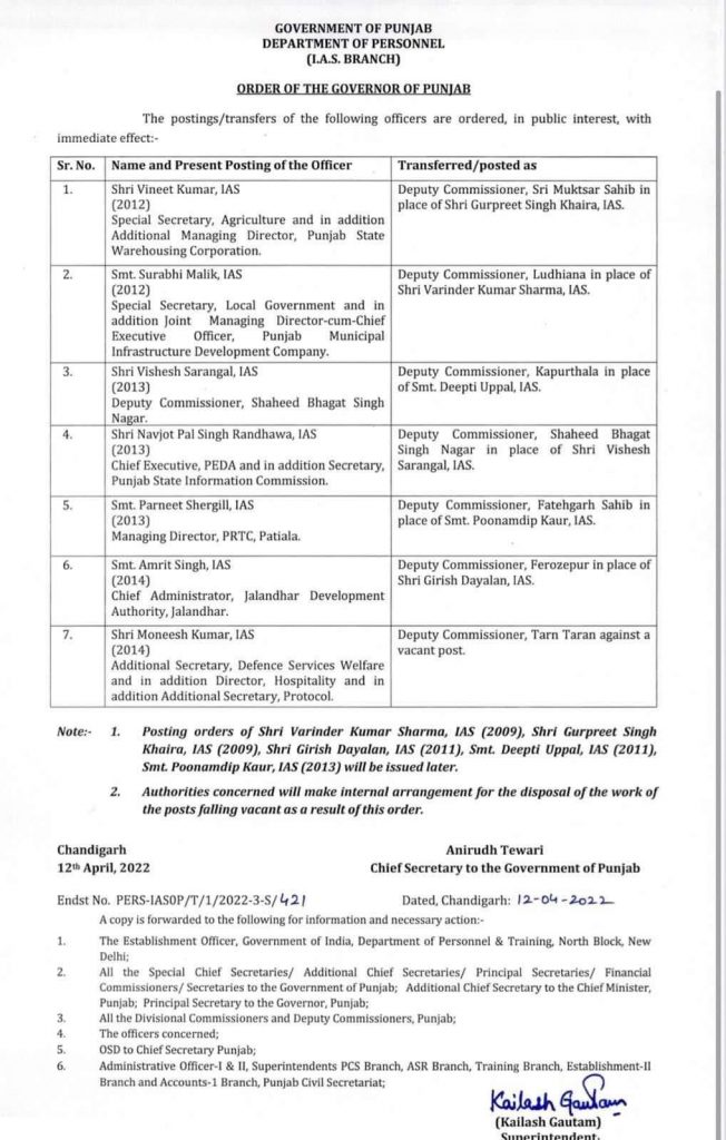आइएएस विनीत कुमार श्री मुक्तसर साहिब, सुरभि मलिक को लुधियाना, विशेष सारगल को कपूरथला, नवजोत पाल सिंह रंधावा को शहीद भगत सिंह नगर, परनीत शेरगिल को फतेहगढ़ साहिब, अमृत सिंह को फिरोजपुर, मोनिश कुमार को तरनतारन में डिप्टी कमिश्नर लगाया गया है।