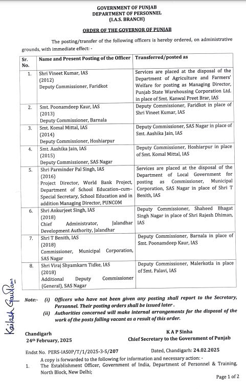 पंजाब : पंजाब में 8 आई.ए.एस . आफिसरों के तबादले किए हैं। अतः जिन अधिकारियों के तबादले हुए हैं, उनमें आई.ए.एस.आफिसर विनीत कुमार डिप्टी कमिश्नर फरीदकोट, पूनमदीप कौर डिप्टी कमिश्नर बरनाला, कोमल मित्तल डिप्टी कमिश्नर होशियारपुर, आशिका जैन डिप्टी कमिश्नर एस .ए.एस. नगर सहित निम्न अधिकारियों के नाम शामिल हैं।