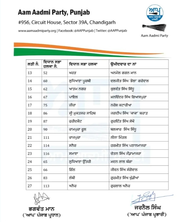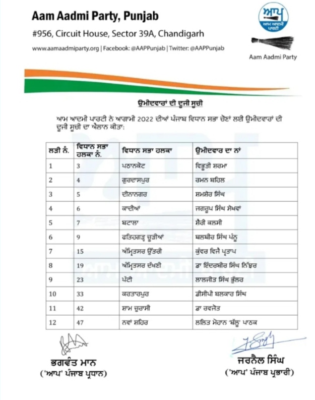 आम आदमी पार्टी ने पंजाब विधानसभा चुनाव 2022 के लिए उम्मीदवारों की दूसरी लिस्ट जारी की