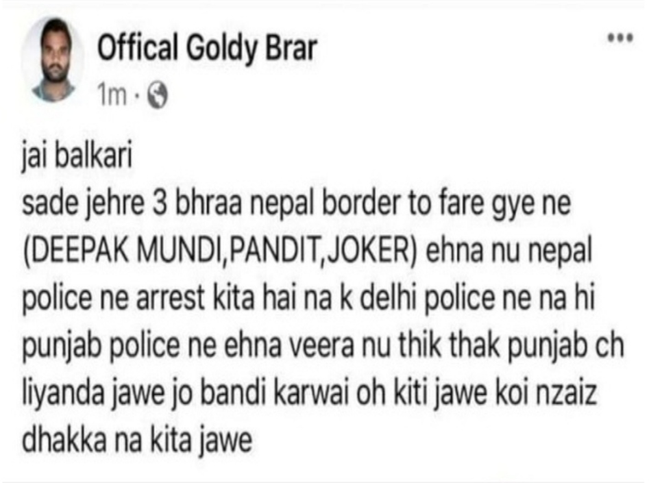 चंडीगढ़ : खबर है कि सिद्धू मूसेवाला हत्याकांड के मास्टरमाइंड गोल्डी बराड़ ने सोशल मीडिया पर एक पोस्ट डालकर दावा किया है कि सिद्धू मूसेवाला हत्याकांड में शामिल उसके करीबी दोस्त दीपक मुंडी, कपिल और राजेंद्र को नेपाल पुलिस ने पकड़ा है, दिल्ली और पंजाब पुलिस ने नहीं। गोल्डी बराड़ ने दीपक मुंडी, कपिल और राजेंद्र की एक फोटो भी शेयर की। वहीँ गोल्डी बराड़ को डर है कि इनका एनकाउंटर हो सकता है। इसलिए यह भी लिखा गया है कि उन पर कानून के मुताबिक उचित कार्रवाई की जाए, कोई नाजायज दबाव न बनाया जाए।