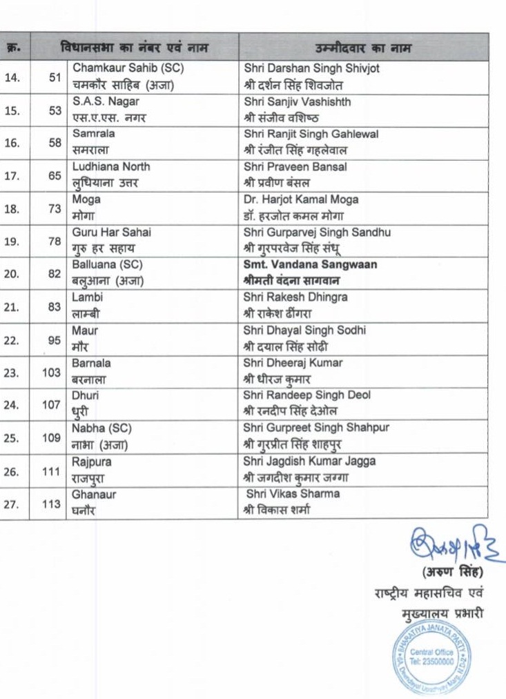 BJP released second list of 27 candidates for Punjab assembly elections पंजाब विधानसभा चुनाव के लिए भाजपा ने जारी की 27 प्रत्याशियों की दूसरी सूची Post author:Anurag Kondal Post published:January 27, 2022 Post category:Punjab Post comments:0 Comments Tags: BJP released second list of 27 candidates for Punjab assembly elections You Might Also Like ‘अग्निपथ’ योजना के विरोध में लुधियाना में युवकों ने रेलवे स्टेशन में की तोड़फोड़; पुलिस पर पथराव के बाद तोड़ी गाड़ी,कई गिरफ्तार June 18, 2022 पंजाब में नगर कौंसिल व नगर पंचायतों के चुनावों का बिगुल बजा August 4, 2023 नवजोत सिद्धू ने मूसेवाला के परिवार से की मुलाक़ात April 3, 2023 Leave a Reply Cancel replyCommentEnter your name or username to comment Enter your email address to comment Enter your website URL (optional)