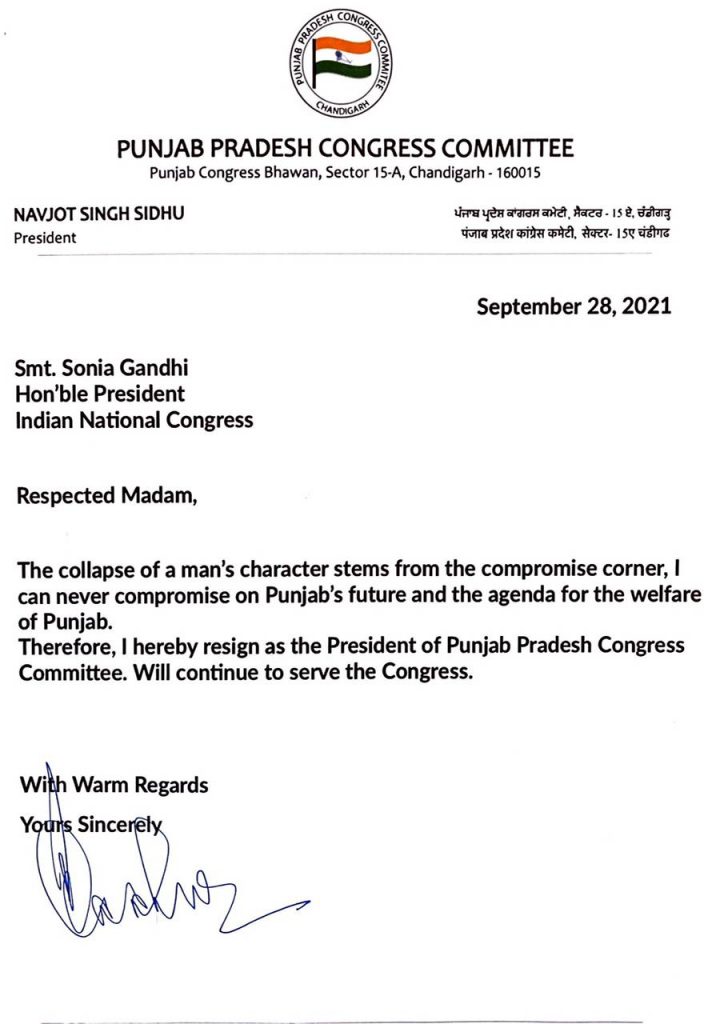 Breaking News : पंजाब से बड़ी खबर – नवजोत सिंह सिद्धू ने दिया पंजाब कांग्रेस अध्यक्ष पद से दिया इस्तीफा