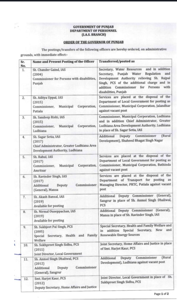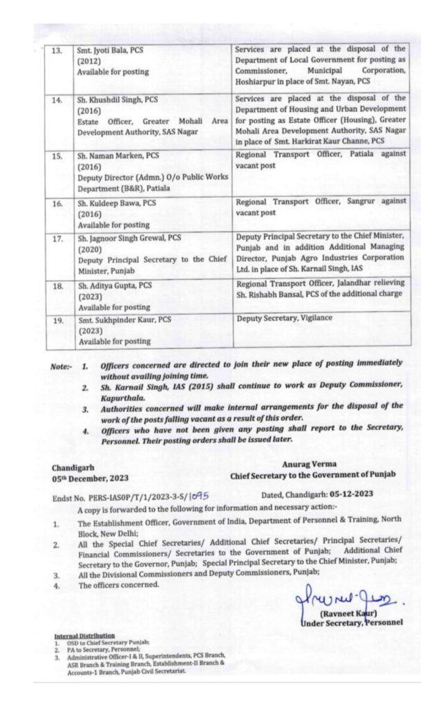 Transfer of IAS and PCS officers in Punjab, read the list जालंधर को मिले नए नगर निगम कमिश्नर व RTO, 19 IAS/PCS अधिकारियों के तबादले Post author:Anurag Kondal Post published:December 5, 2023 Post category:Jalandhar Post comments:0 Comments पंजाब : खबर है कि पंजाब में 8 आई.ए.एस. व 11 पी.सी.एस. अधिकारियों के तबादले किए गए हैं। पंजाब सरकार द्वारा यह आदेश जारी किए हैं। सूची के अनुसार आदित्य उप्पल अब जालंधर के नए नगर निगम कमिश्नर होंगे। अधिकारियों के तबादले की सूची इस प्रकार है….. Tags: 19 IAS/PCS officers transferred, Jalandhar gets new Municipal Corporation Commissioner and RTO You Might Also Like पूरा वेतन देने के नाम पर होमगार्ड से मांग रहा था पांच हजार, एसआइ रंगे हाथ रिश्वत लेते गिरफ्तार June 16, 2021 जालंधर में ‘गन कल्चर’ के खिलाफ सख्त कार्रवाई, 538 असलहा लाइसेंस रद्द March 17, 2023 विधायक रमन अरोड़ा को अदालत ने दी बड़ी राहत, मिली जमानत September 22, 2025 Leave a Reply Cancel replyCommentEnter your name or username to comment Enter your email address to comment Enter your website URL (optional)