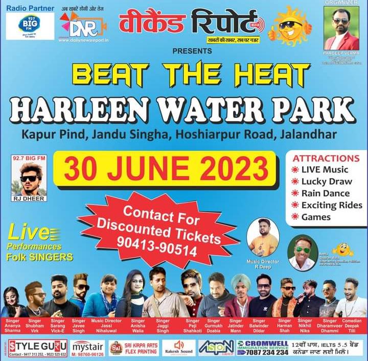 जालंधर : भीषण गर्मी में अगर आपको पानी में परिवार और दोस्तों के साथ पंजाबी गायकों के गीतों के बीच मस्ती करने का अवसर मिले तो क्या आप उस अवसर को खोना चाहेंगे, बिल्कुल खोना नहीं चाहेंगे। तो फिर वो अवसर आपके पास आ गया है। वीकैंड रिपोर्ट की तरफ से बीट द हीट कार्यक्रम हरलीन वाटर पार्क, जंडू सिंघा, कपूर पिंड में आयोजित किया जा रहा है। जिसमें लोग नहाने के साथ लाइव म्यूजिक का भी आनंद ले पाएंगे। इस कार्यक्रम की तारीख है 30 जून और दिन है शुक्रवार।