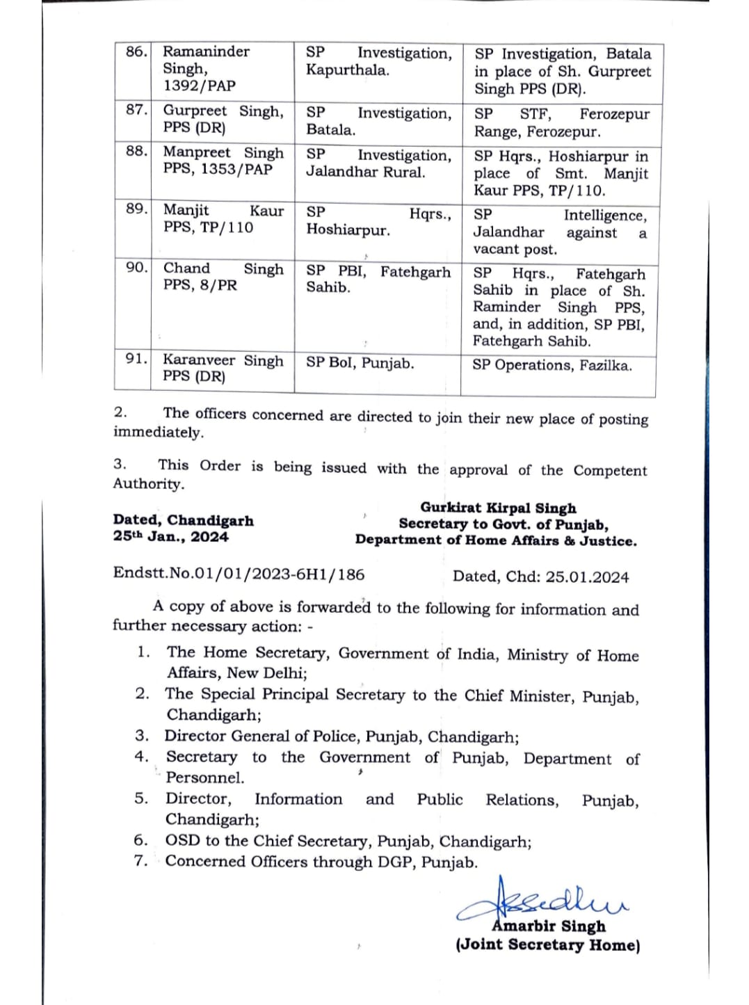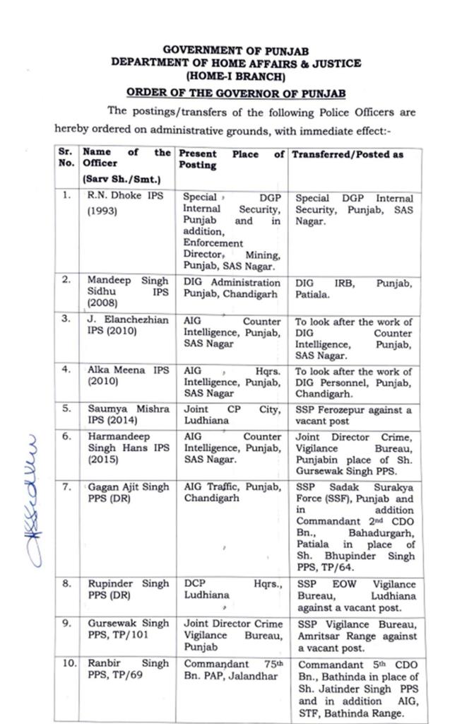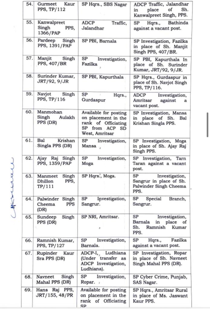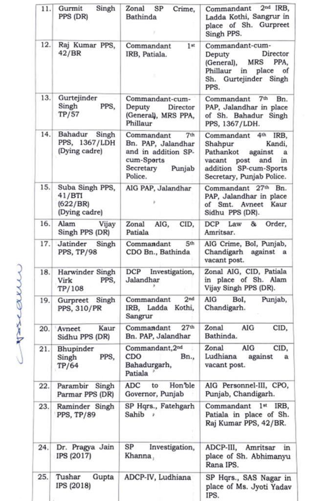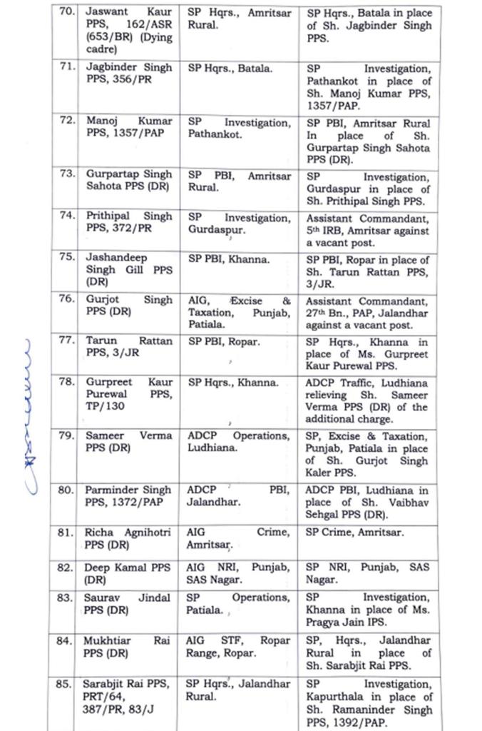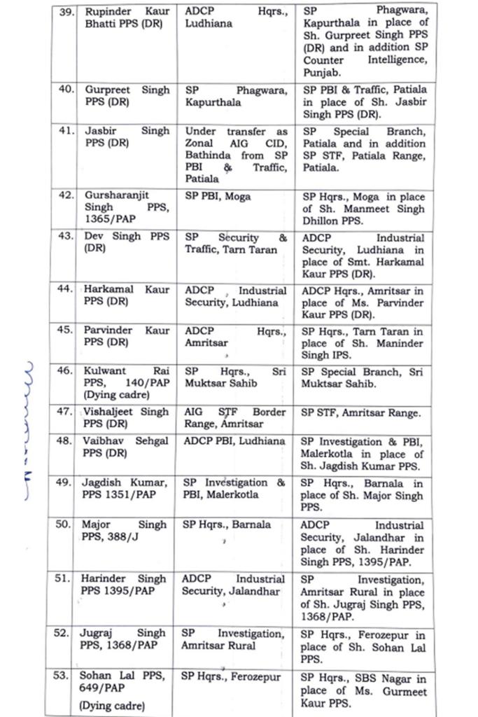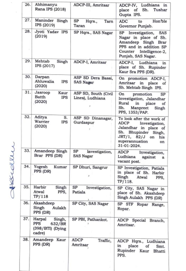Major reshuffle in Punjab Police, 91 IPS-PPS officers transferred पंजाब पुलिस में बड़ा फेरबदल, 91 IPS-PPS अधिकारियों के तबादले Post author:Anurag Kondal Post published:January 25, 2024 Post category:Punjab Post comments:0 Comments पंजाब : 26 जनवरी से पहले पंजाब सरकार ने पुलिस विभाग में बड़ा फेरबदल किया है। इसके मद्देनजर पुलिस अधकारियों और कर्मचारियों के तबादले किए है। जिन अधिकारियों के तबादले किए गए है, उनमें 91 IPS और PPS अधिकारी शामिल है, जिसकी सूची इस प्रकार हैः- Tags: 91 IPS-PPS officers transferred, Major reshuffle in Punjab Police Read more articles Next Postपंजाब पुलिस में बड़ा फेरबदल, 22 IPS अधिकारियों के हुए तबादलें You Might Also Like पंजाब में दो गुटों में चली ताबड़तोड़ गोलियां, दो लोगों की मोके पर मौत , एक गंभीर ज़ख़्मी May 27, 2021 पंजाब में 2 IAS और 57 PCS अधिकारियों का ट्रांसफर , देखें लिस्ट November 28, 2025 पंजाब में गर्मी का प्रकोप : 44.5 डिग्री पहुंचा पारा, अगले तीन दिन के लिए अलर्ट जारी May 16, 2024 Leave a Reply Cancel replyCommentEnter your name or username to comment Enter your email address to comment Enter your website URL (optional)