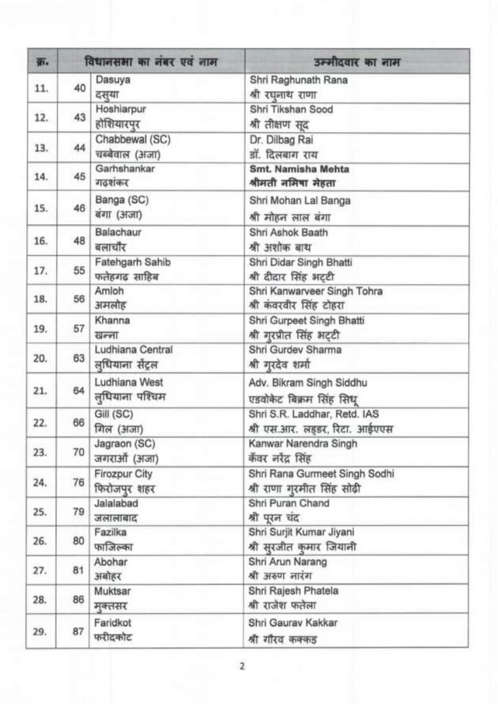 पंजाब विधानसभा चुनाव 2022 : BJP ने जालंधर से भंडारी, भगत व कालिया को दी टिकट ,34 प्रत्याशियों की पहली सूची की जारी