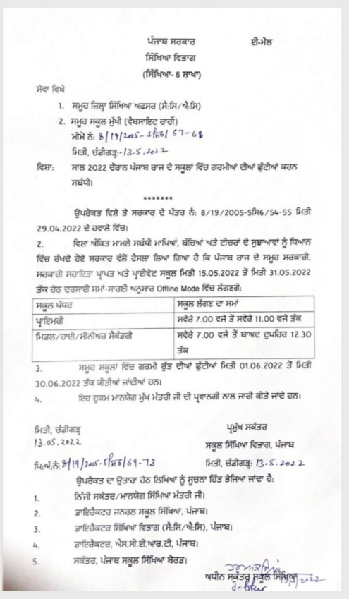Timings of schools in Punjab changed from 1st April, read the new timings पंजाब सरकार ने अपने ही फैसले पर मारी पलटी , स्कूलों की गर्मी की छुट्टियों के बारे में जारी किये नए निर्देश Post author:Anurag Kondal Post published:May 13, 2022 Post category:Punjab Post comments:0 Comments चंडीगढ़ : आपको बता कि भीषण गर्मी को देखते हुए जहां पंजाब सरकार ने ऐलान किया था कि बच्चों को स्कूलों में छुट्टियाँ मई की 15 तारीख़ से कर दी जाएगी वहीँ अब उस फ़ैसले पर दोबारा से सरकार ने यू टर्न लिया है। अब नए निर्देश जारी कर दिए है :- Tags: issued new instructions regarding summer vacations of schools, Punjab government reversed its own decision You Might Also Like केंद्रीय गृह मंत्री अमित शाह को मिलने उनके आवास पर पहुंचे कैप्टन अमरिंदर सिंह, BJP में शामिल होने की अटकलें हुई तेज़ September 29, 2021 अब बाहर से आने वाली गाड़ियों को रोक ट्रेफिक पुलिस चलान नहीं काटेगी, गलती होने पर समझा कर छोड़ेगी March 9, 2022 अभिनेत्री शहनाज गिल के पिता को मिली जान से मारने की धमकी October 8, 2022 Leave a Reply Cancel replyCommentEnter your name or username to comment Enter your email address to comment Enter your website URL (optional)