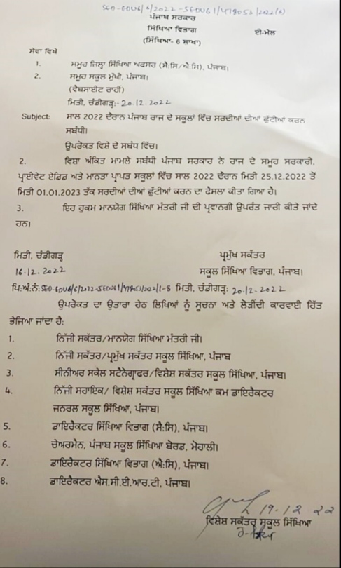 चंडीगढ़ : पंजाब में सर्दियों की छुट्टियों की घोषणा कर दी गई है। पंजाब सरकार के जारी आदेशों के अनुसार राज्य के सभी स्कूलों में 25 दिसंबर 2022 से 1 जनवरी 2023 तक अवकाश की घोषणा की गई है। इस संबंध में सभी समूह जिला शिक्षा अधिकारियों, स्कूल प्रिंसिपल समेत वेबसाइट के माध्यम से भी सूचना दी गई है। जारी आदेशों के अनुसार, पंजाब में सभी सरकारी, प्राइवेट, एडिड और मान्यता प्राप्त स्कूलों में अवकाश रहेंगे।